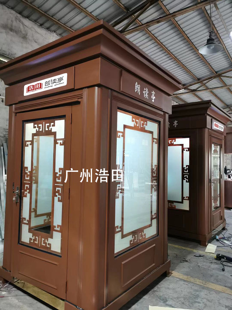 朗讀亭尺寸定制:1.7*1.7*3.0米或者1.5*1.5*3.0米(可以根據(jù)您要求來定制朗讀亭)朗讀亭亭身及基座均采用汽車鈑金機加工成型,表面噴戶外氟碳漆處理,有部分客人問道這個朗讀亭封閉式的不悶嗎?里面這么小,怎么處理呢?其實朗讀亭內(nèi)部是可以裝空調(diào)的,還能裝換氣扇,只是要把空調(diào)做成隱藏起來的,整個亭身的裝飾采用激光切割而成,內(nèi)墻及吊頂均采用不銹鋼制作而成,內(nèi)部采用雙層防火保溫板,具有隔熱、保溫的功能,走暗敷線路,內(nèi)飾搭配暖光燈效果,整個亭子是非常溫馨的。